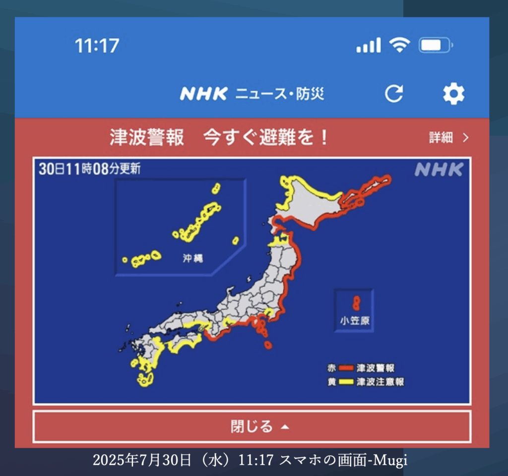 7月30日午前、Mugikoは、地震が発生していたことを知らず、スマホの画面で津波警報・注意報のニュースを見て驚きました。津波は一度だけでなく何度でも押し寄せます。海底の地形や海岸線や河川の状況やその時々の潮位によっても影響が異なります。日本では、子供たちの学校もちょうど夏休み、家族で海水浴に来ていたり、海外からの観光客も突然の避難に動転されたと思います。また、日本各地、酷暑が続き、冷房がない場所への避難は、相当に厳しい状況であったとニュースでも報道されていました。
