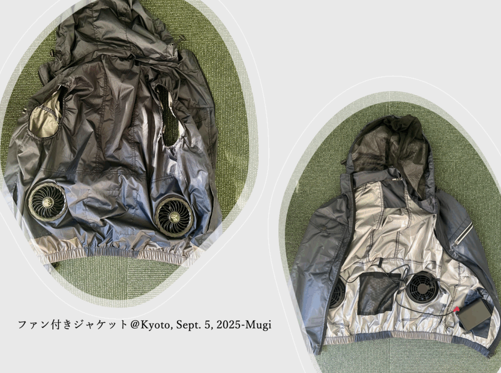 今年、Mugikoが気になっているのは、郵便や宅配の配達や建設現場などで見かけるファン付きジャケットです。ベストや上着の内側にファンがついてで電動で回転し体に風を送ります。荷物を配達してくださった方に聞いてみました。「そのジャケット、涼しいですか?」「いや〜、気温が高い場所では風もむわっと暑く、でも、病院などに荷物を運ぶ時には、涼しい風になります」と。このジャケットを着て活動している人を見ると、どんな季節や状況でも、そこで活動する人のおかげで現場が維持される、すごいことだと思います。実は、Mugikoもこのジャケットを入手したのですが、猛暑の中、外での作業自体を控えてしまい、ジャケットの出番がありません。